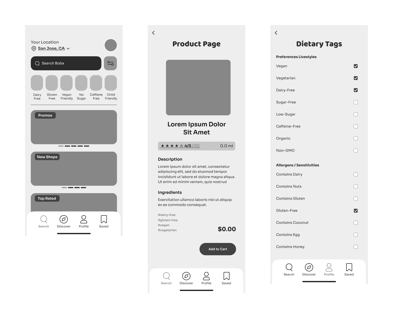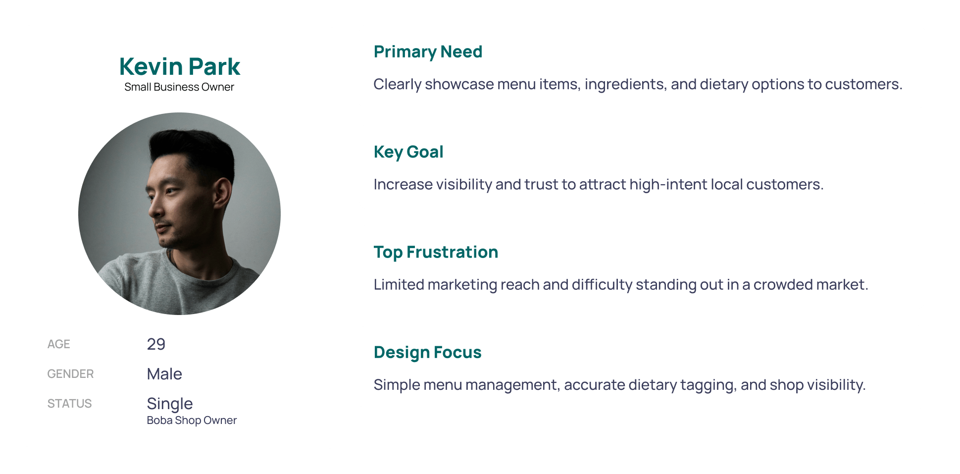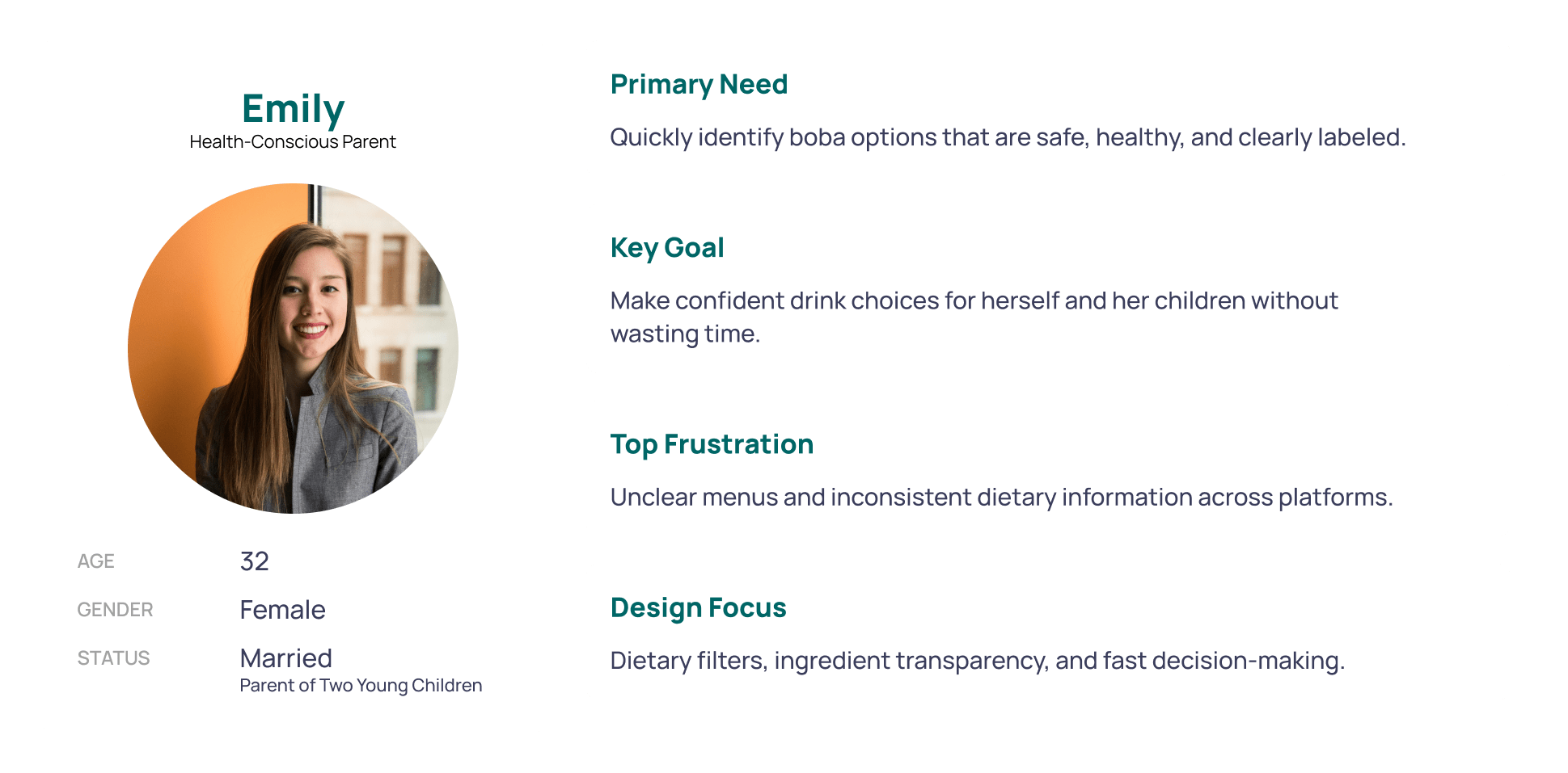 Three personas were drafted to represent the core stakeholders in the Boba Beacon ecosystem. The health-conscious parent persona primarily guided the customer flow, shaping decisions around filtering, dietary clarity, and speed. The boba shop owner persona guided the vendor flow, informing how menu items and dietary tags are added and managed. Together, these personas ensured the experience supported both confident discovery and accurate data entry.