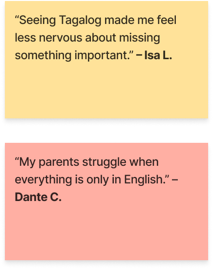→ Design impact: Informed the English/Tagalog language toggle and AI-assisted dialect support (e.g., Ilocano), prioritizing visibility and ease of access rather than buried translation tools.