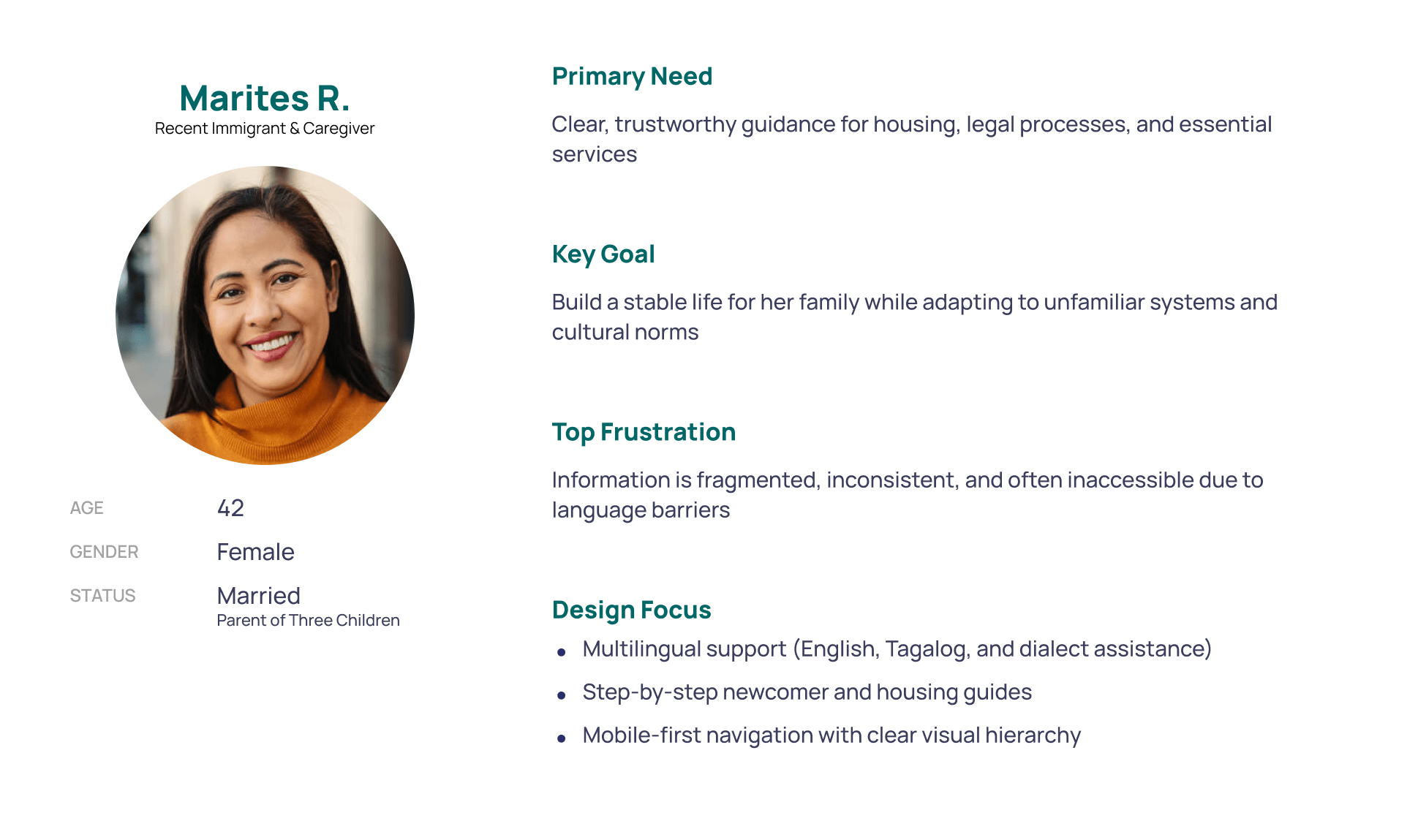 Marites represents users experiencing the highest friction and risk during relocation. Designing for her ensured the platform prioritized clarity, accessibility, and trust—while still supporting the needs of long-time residents and second-generation users through community and cultural features.