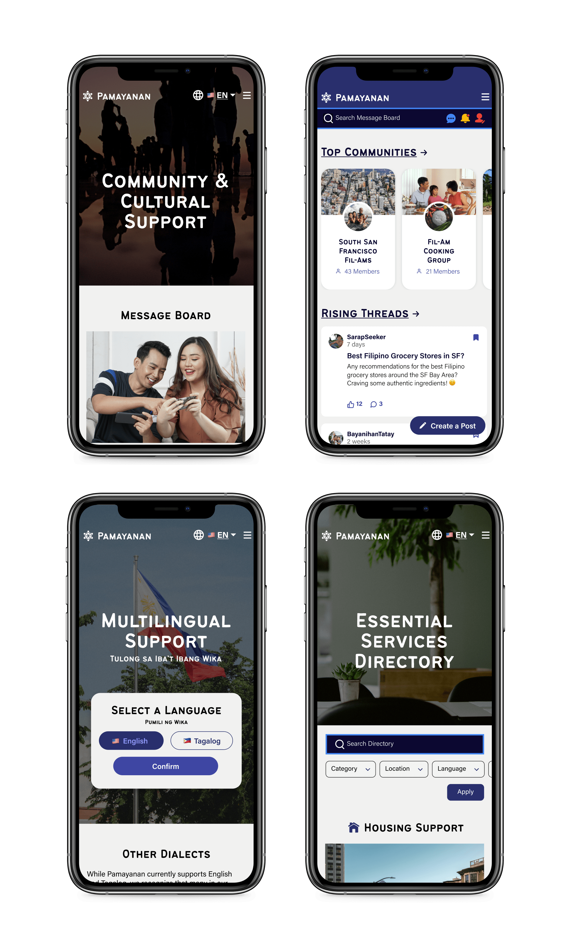 Users can create an account, switch languages, browse community resources, search or post in message boards, and filter essential services—all through clear, mobile-optimized flows designed for confidence and ease of use.