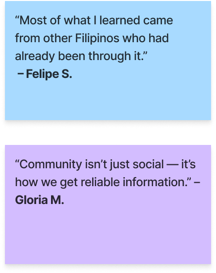 I conducted interviews with first- and second-generation Filipino immigrants, community members, and small business owners across multiple age groups. I synthesized findings using an affinity map to surface recurring patterns, pain points, and unmet needs—particularly around housing navigation, legal systems, language access, and community connection—which directly informed feature prioritization and design decisions.