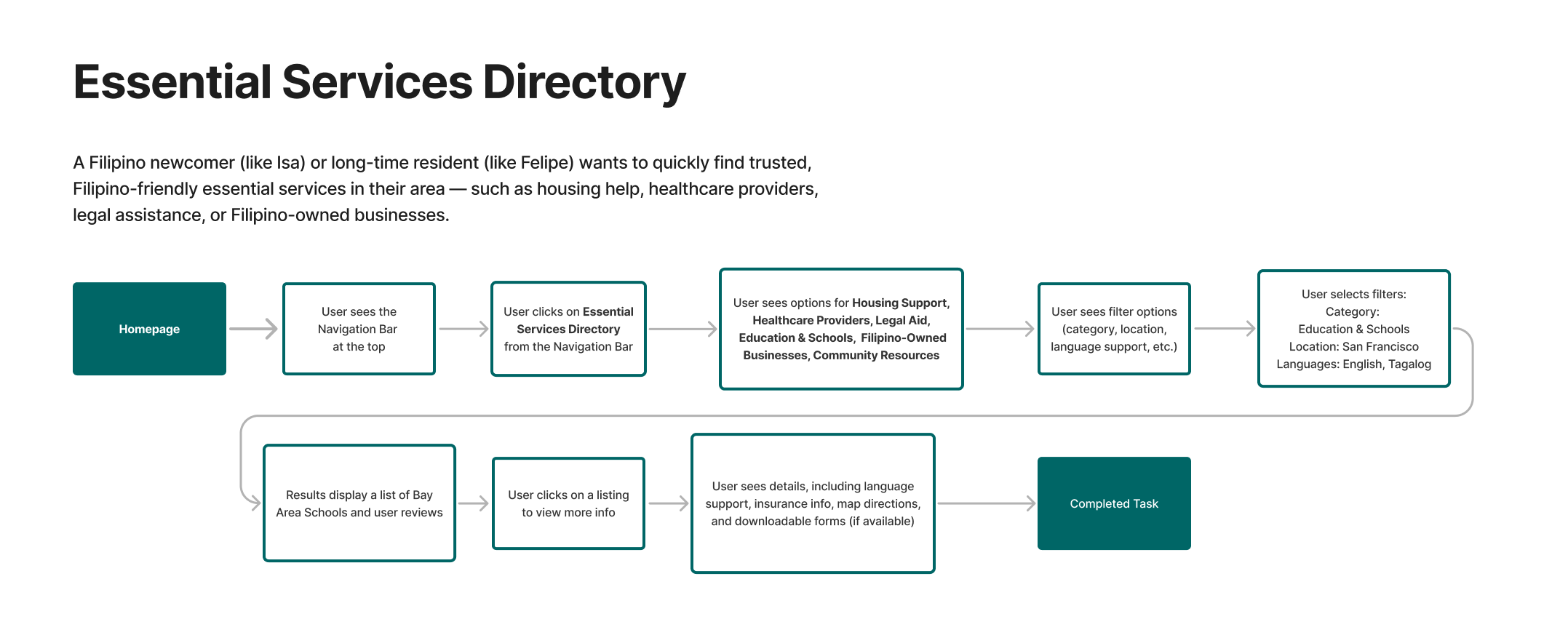 The final prototype integrates community forums, multilingual support, and a vetted essential services directory into a single experience. Usability testing showed high task completion, strong emotional resonance—especially around language access—and increased user confidence when navigating complex information.