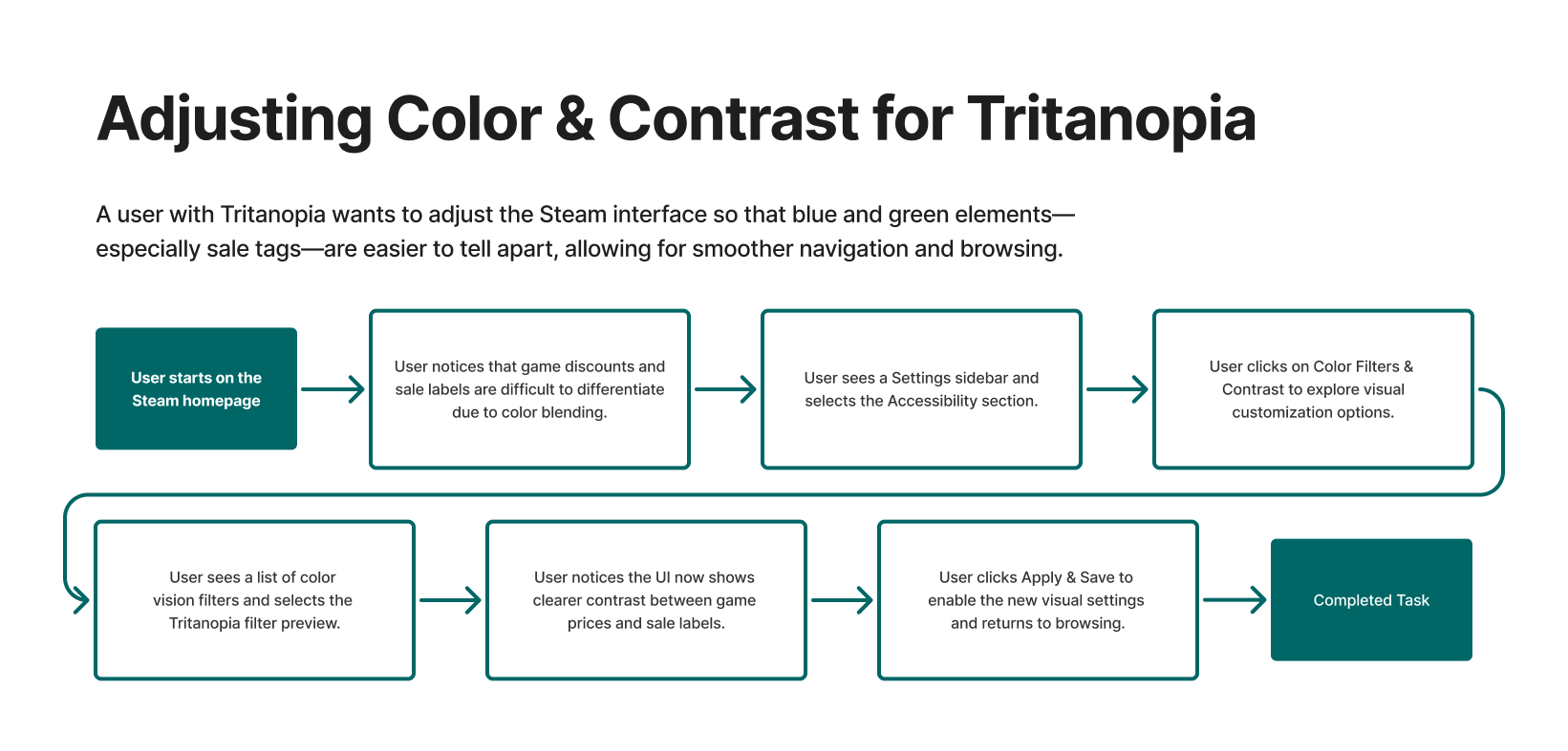 Two task flows were initially explored to support both visual and physical accessibility needs. Based on research findings and project scope, the flow for adjusting color and contrast for Tritanopia was selected and adapted as the primary design focus, as it best demonstrated how a platform-level accessibility feature could improve discoverability, clarity, and user confidence within Steam’s existing interface.