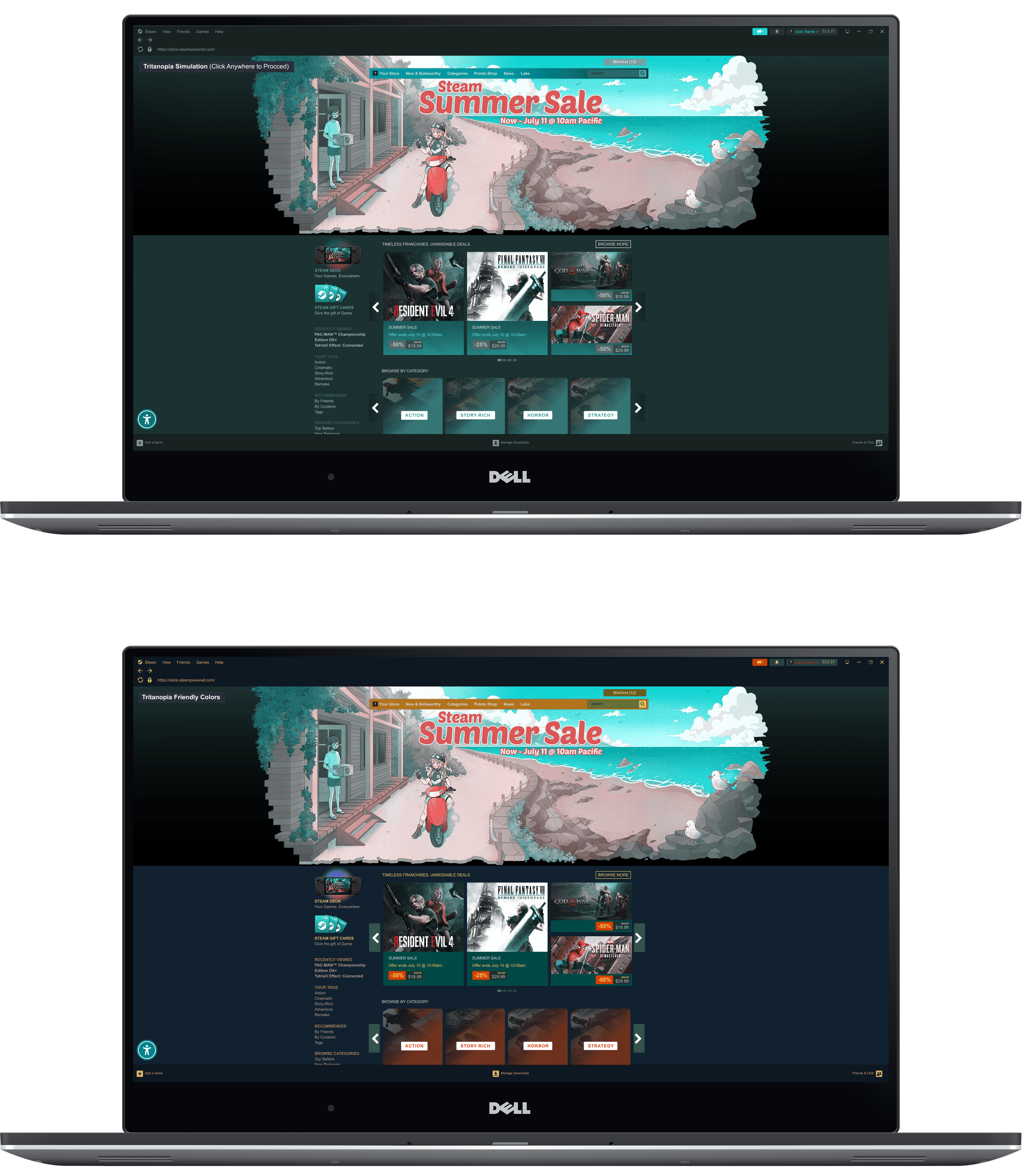Preview of the Steam interface as experienced by users with Tritanopia, followed by the adjusted color configuration designed to improve contrast, clarity, and readability