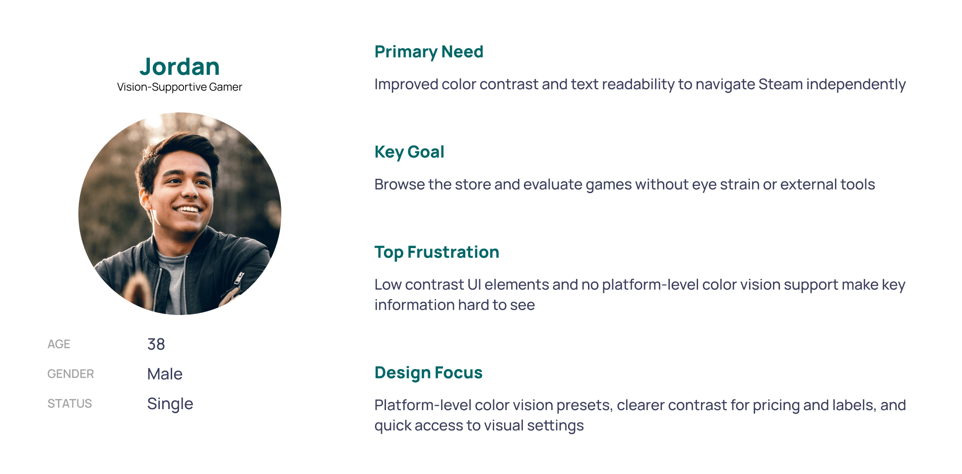 Three personas were drafted to represent a range of accessibility needs across Steam. While each persona informed the broader problem space, the vision-supportive gamer most directly guided design decisions—shaping the focus on color contrast, visual clarity, and platform-level accessibility settings.