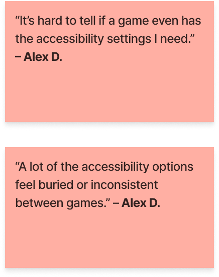 I conducted five in-depth interviews with gamers aged 26–43, including players with visual impairments, motor limitations, temporary injuries, and accessibility advocates. Using affinity mapping, I identified three key clusters that directly informed the Tritanopia task flow and visual accessibility design.
