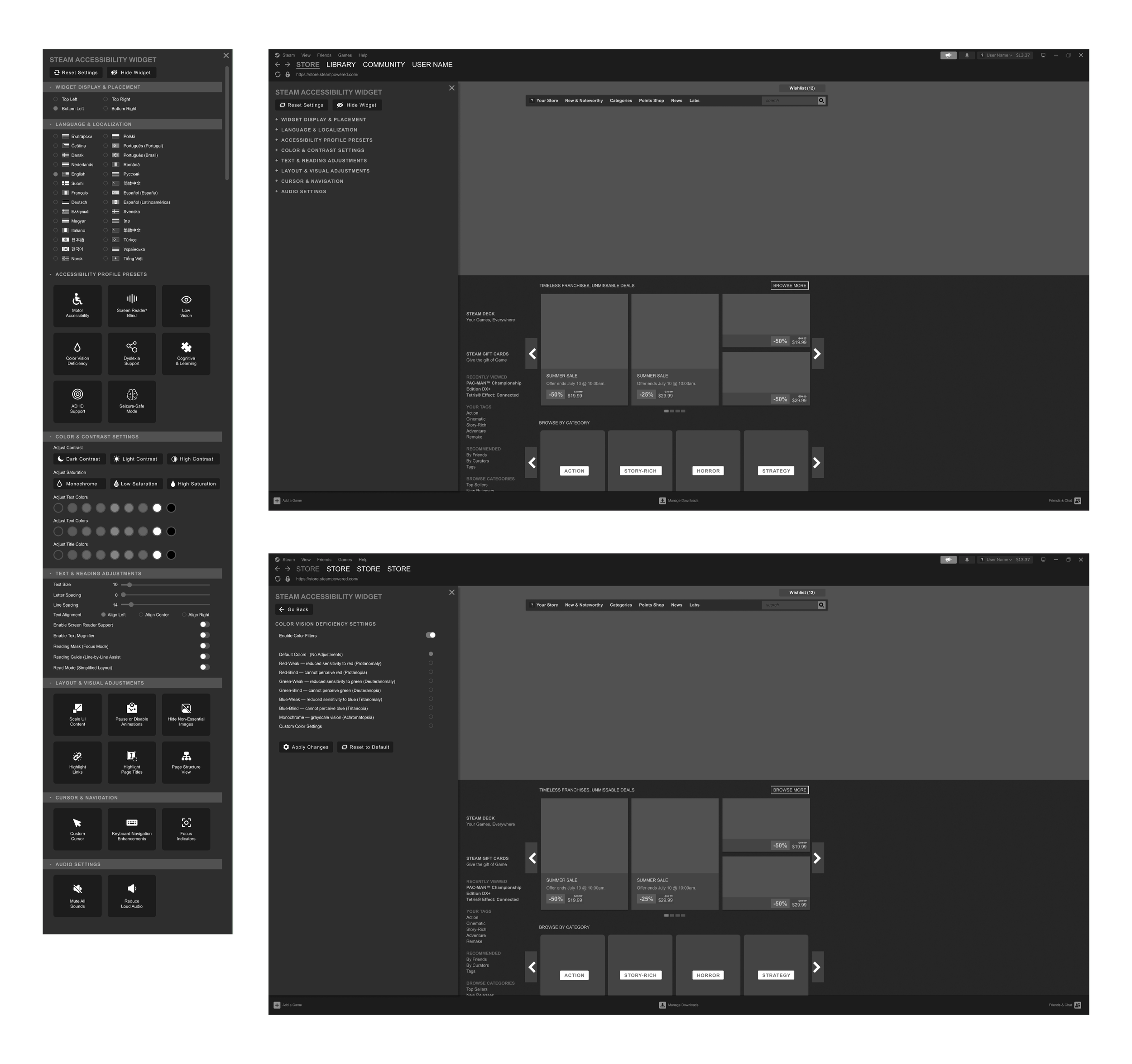 Mid-fidelity wireframes focused on information hierarchy, discoverability, and integration within Steam’s existing desktop interface. Early exploration tested where an Accessibility Widget could live without disrupting established navigation patterns.